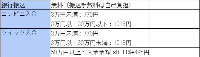 銀行振込の場合、入金手数料はかかりませんが、コンビニ入金、クイック入金を利用する場合、手数料がかかってしまいます。