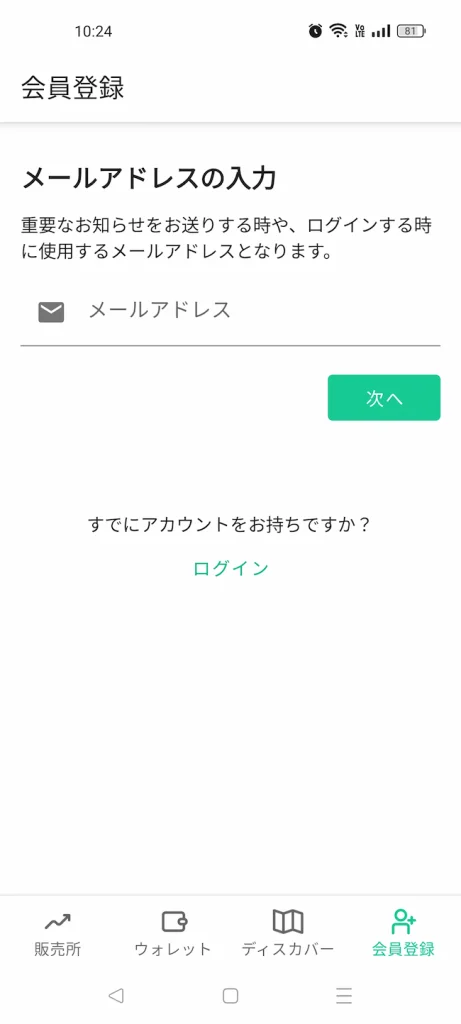 アプリを起動したら、トップ画面の「会員登録」から新規アカウントを作成していきます。