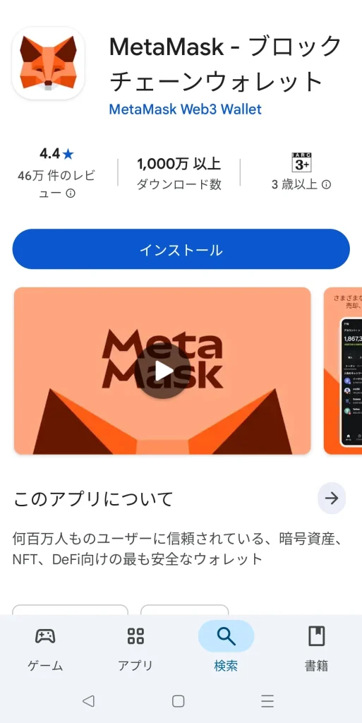 スマホで使いたい方は、App Store(iOS)またはGoogle Play(Android)で「MetaMask」と検索してインストールします。