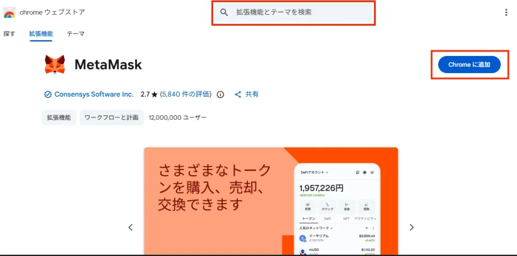 上の検索バーに「MetaMask」と入力し、「Chromeに追加」→「拡張機能を追加」をクリックします。