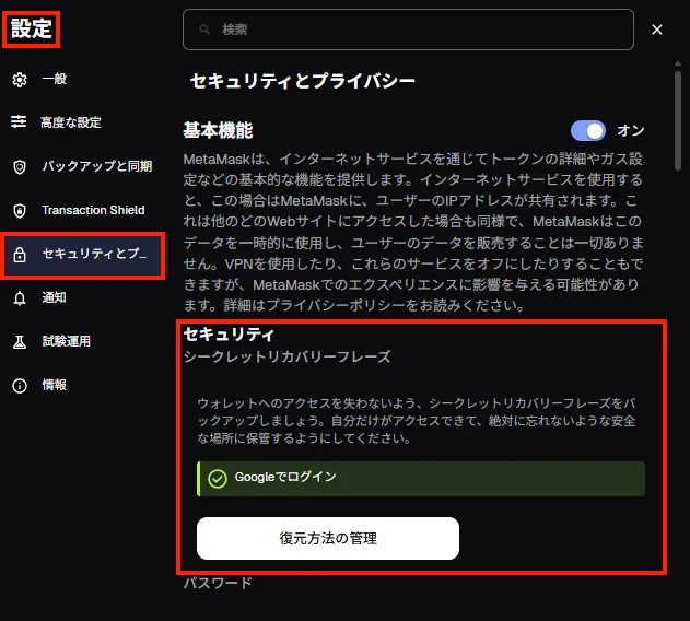 パスワード設定後に「シークレットリカバリーフレーズ(Secret Recovery Phrase)」を確認しておきましょう。